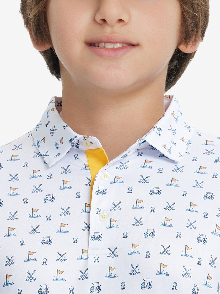 Get your little golfer ready for adventures with our 'Stylish Print Boys Polo Shirts.' Crafted from top-notch fabric that wicks moisture, stays light, and shields with UPF 30+. Let him swing freely with the split hem and stretchy fabric. Watch him rock the course in fun animal and plant prints that never fade, making him the cutest golfer around!