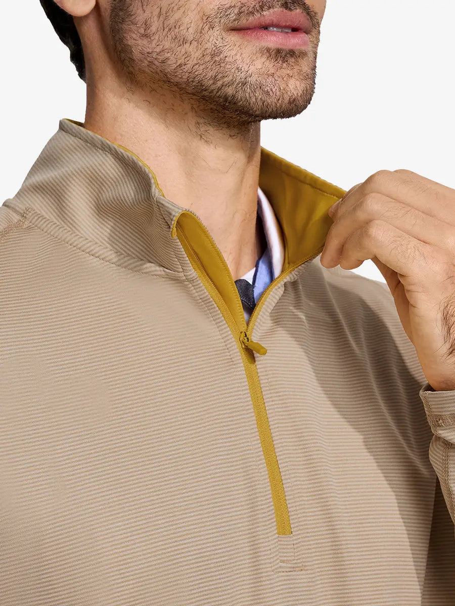 Our men's quarter zip pullover is made from high-quality yarn-dyed striped polyester, offering moisture-wicking, breathability, UPF30+ protection, and 4-way stretch for ultimate comfort. The stylish design features a 1/4 zipper for easy wear and a mock neck for UV protection and warmth. Ideal for outdoor activities and athletic performance.