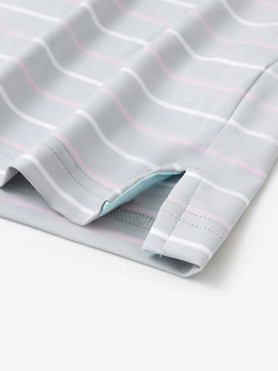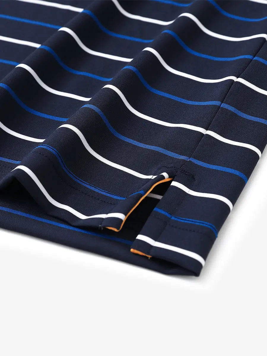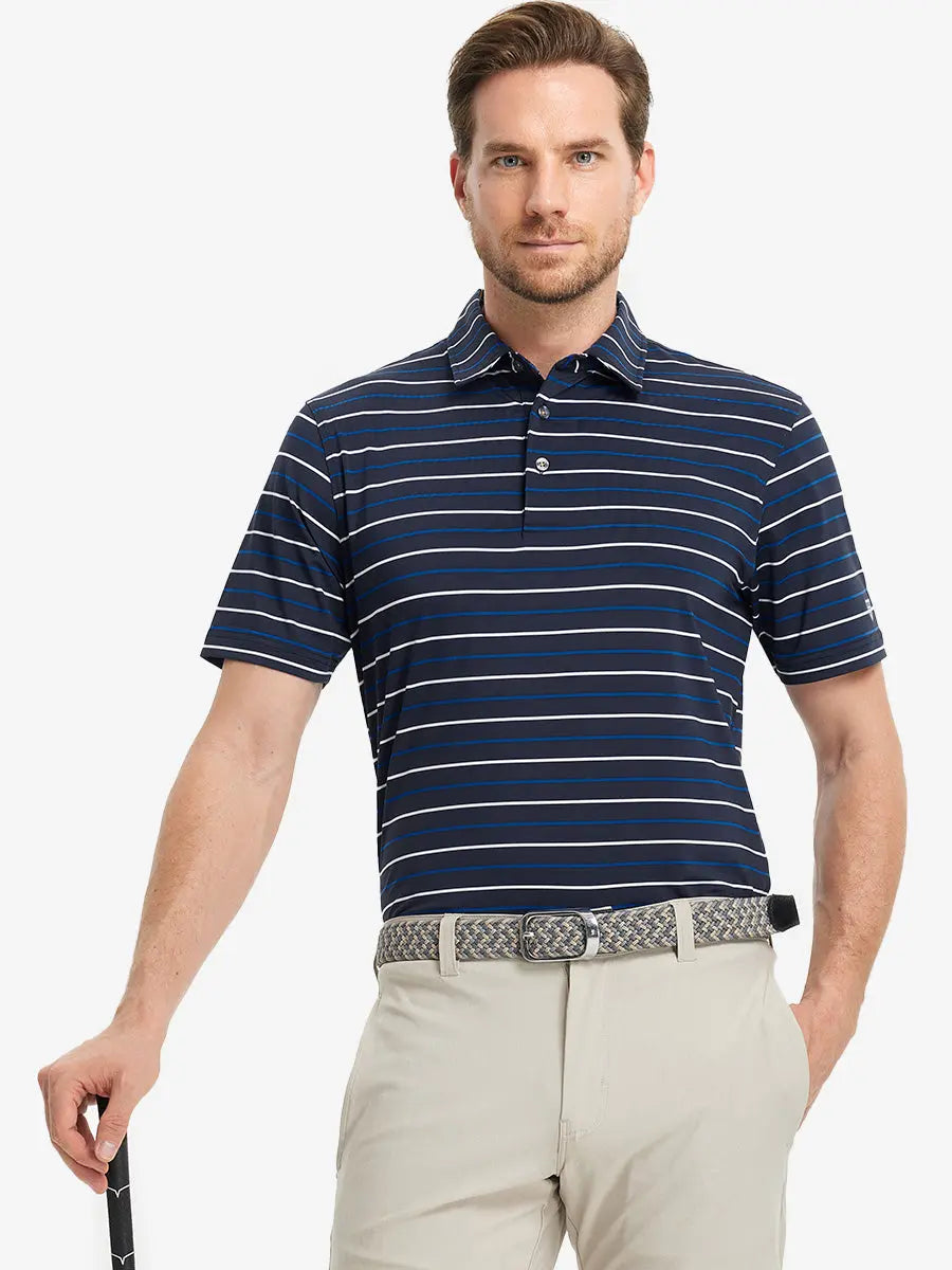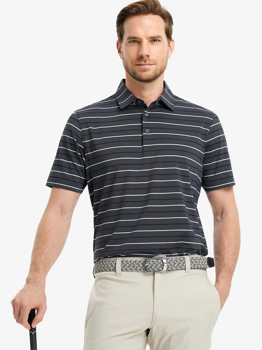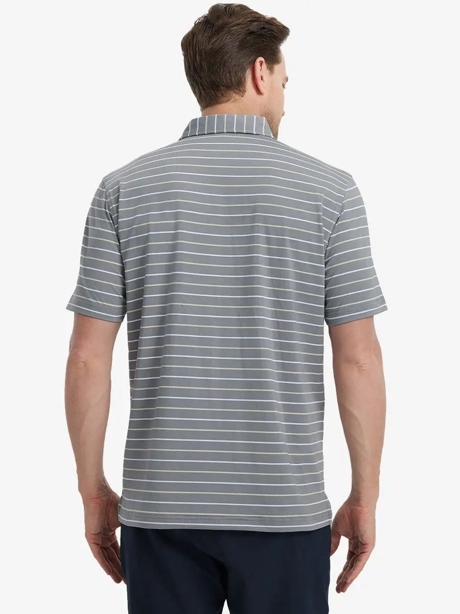 Our men's golf shirt features yarn-dyed stripes and is made from high-end polyester-spandex material, providing softness and breathability. It effectively wicks moisture to keep you cool and dry. With 4-way stretch fabric, this polo ensures full range of motion for any golfer. Ideal for the course or casual wear.