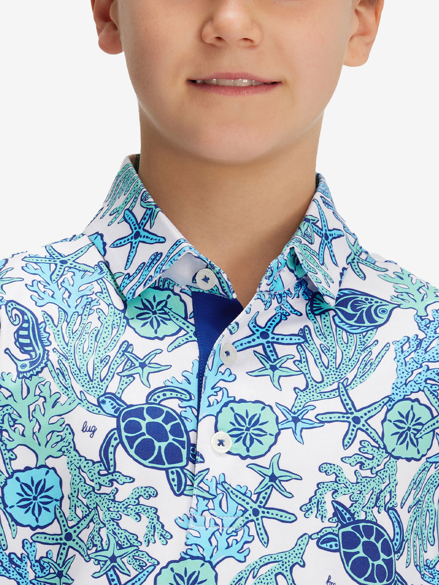 Get your little golfer ready for adventures with our Performance Print Boys Golf Polo. Crafted from top-notch fabric that wicks moisture, stays light, and shields with UPF 50+. Let him swing freely with the split hem and stretchy fabric. Watch him rock the course in fun animal and plant prints that never fade, making him the cutest golfer around!